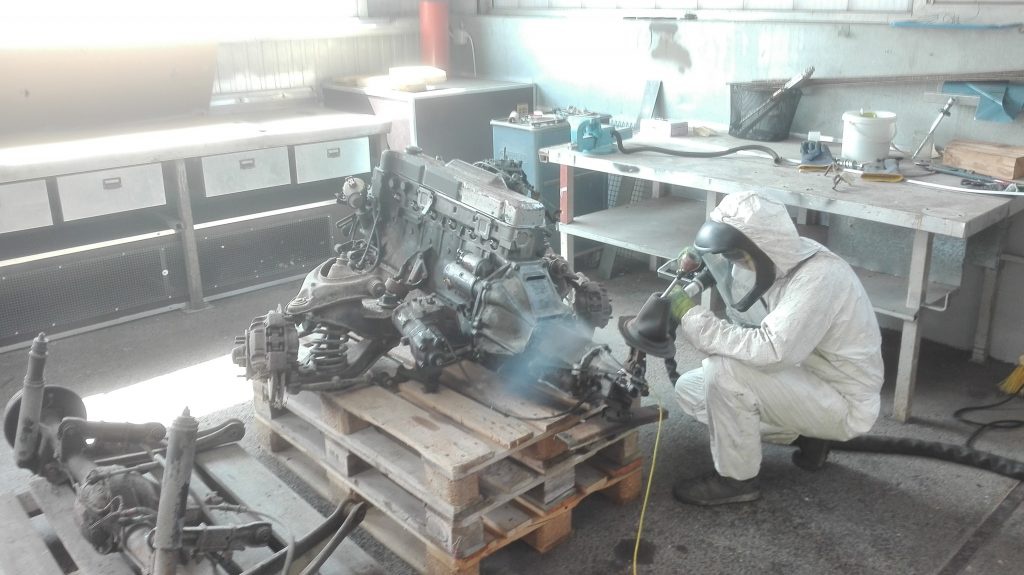 In der Kfz-Werkstätte mit 300 Quadratmetern, einer 4 Tonnen Hebebühne sowie zwei Strahlplätzen für Motoren, Achsen oder Kleinteilen werden die Trockeneis-Strahlarbeiten durchgeführt.